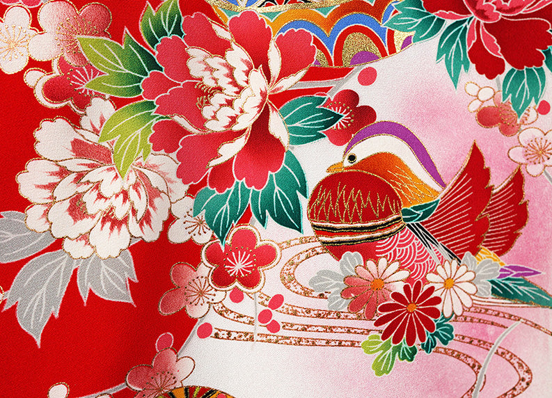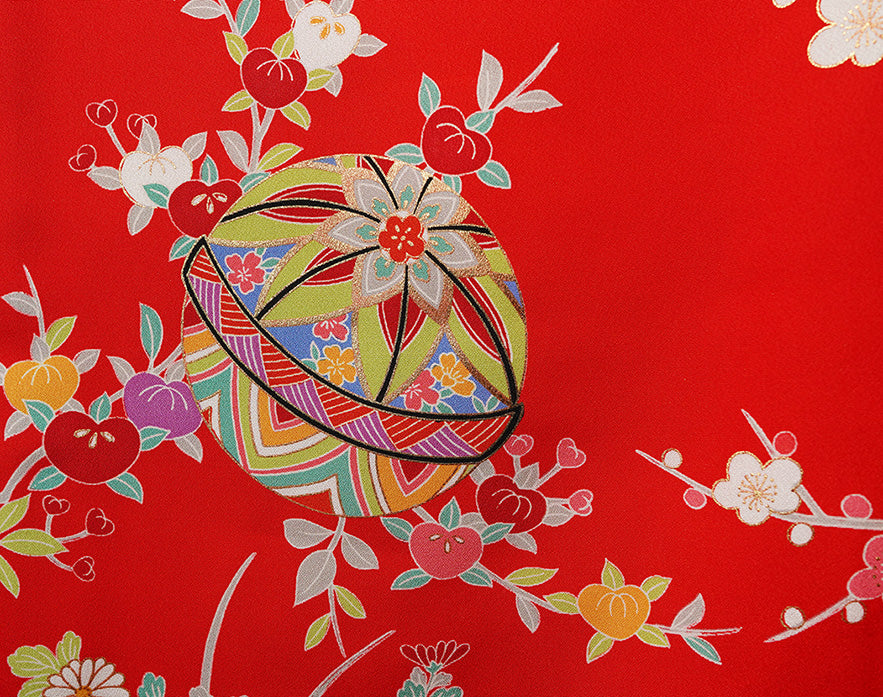 鮮やかな赤地に、可愛らしい毬と優雅なオシドリ