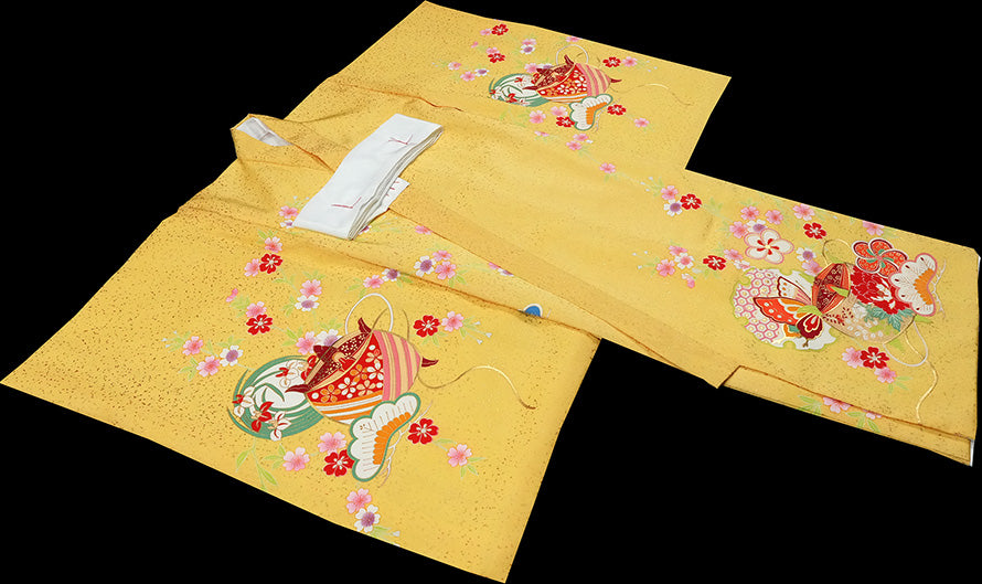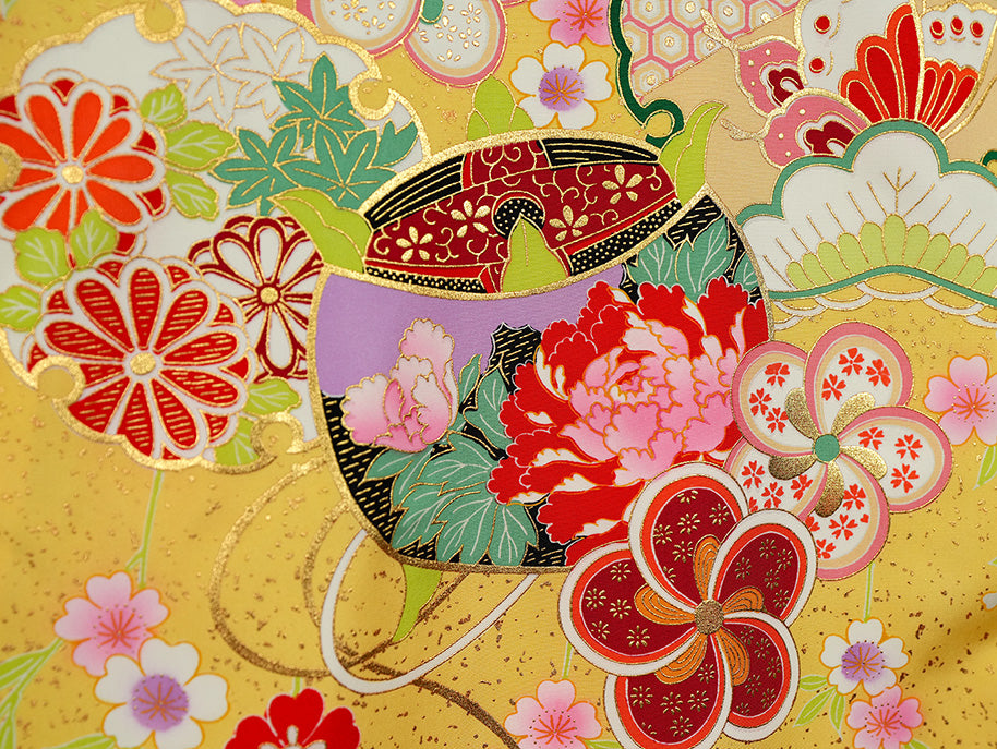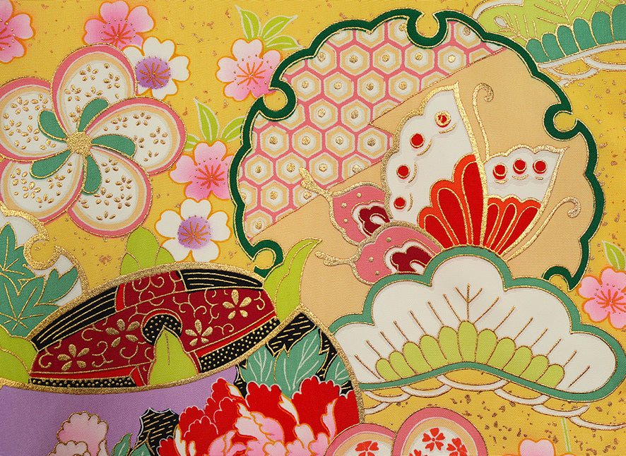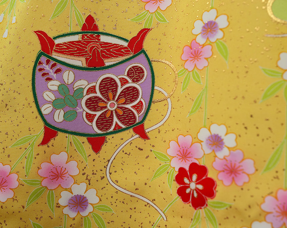 可愛らしい黄色地に金加工を施し、華やかで個性的な存在感のある一枚です。