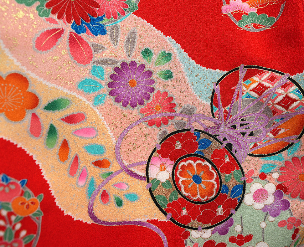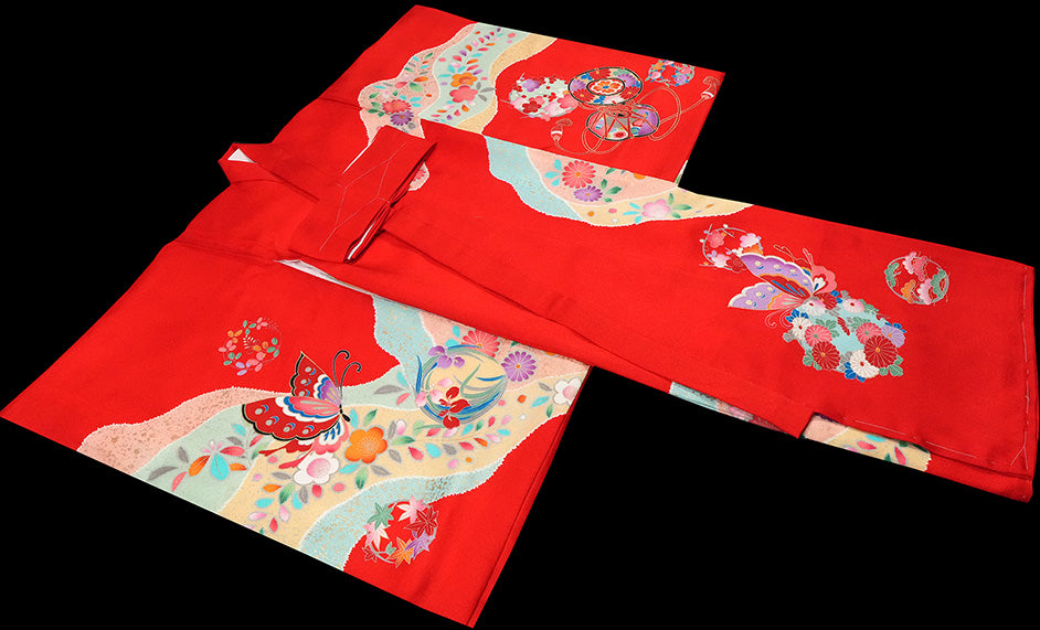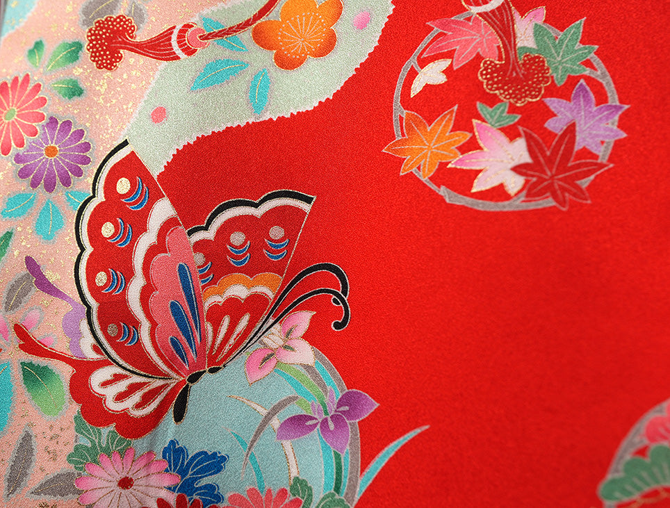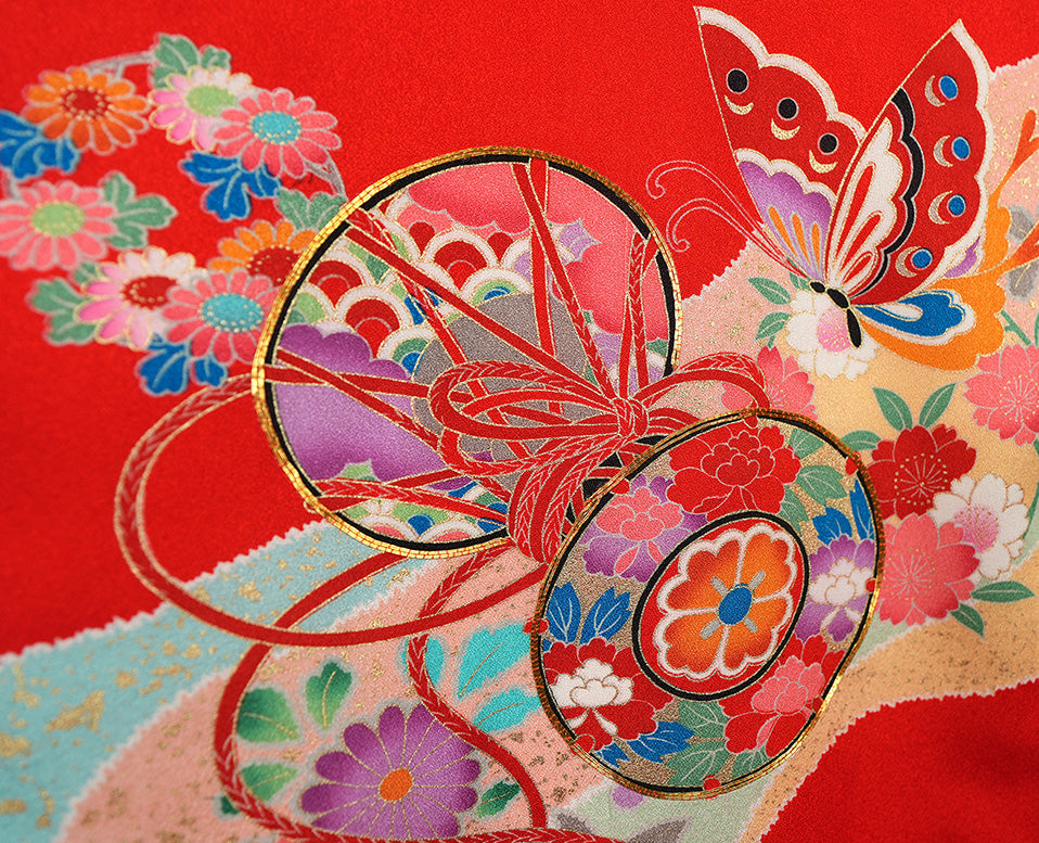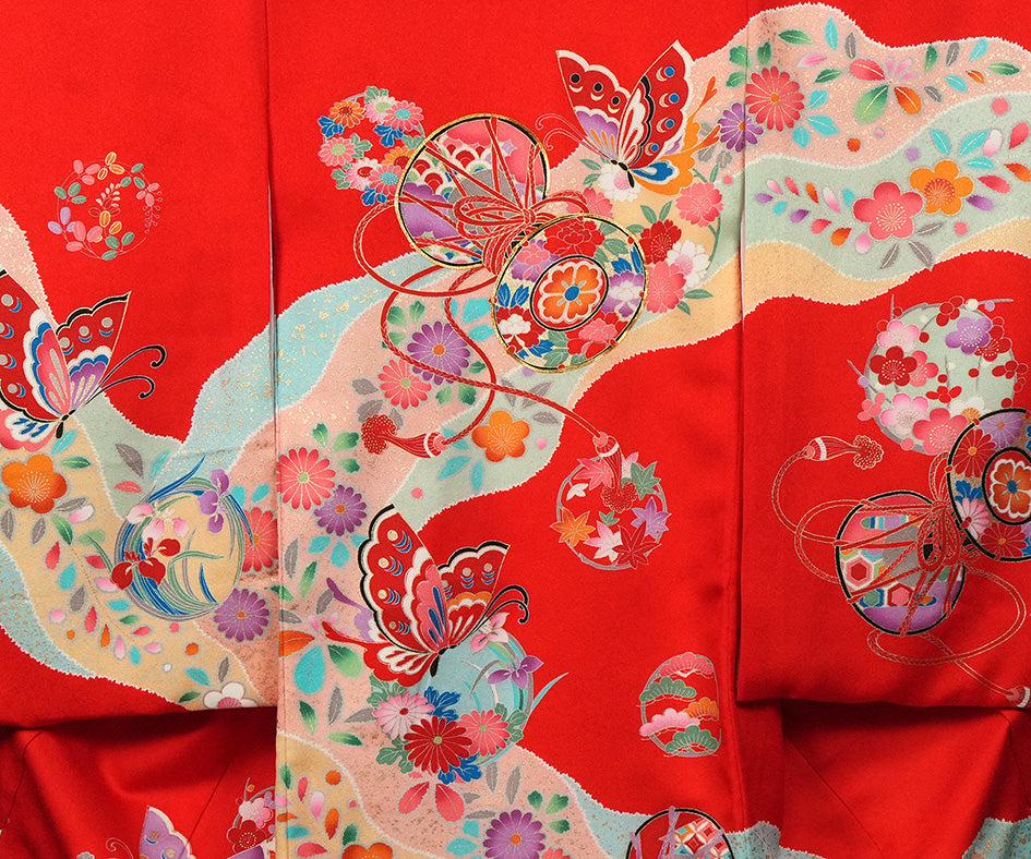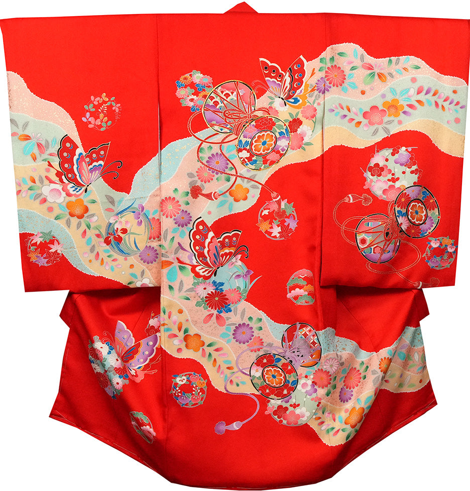 可愛らしく舞い飛ぶ蝶をあしらった華やかな祝着です。