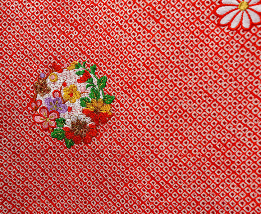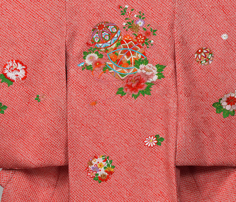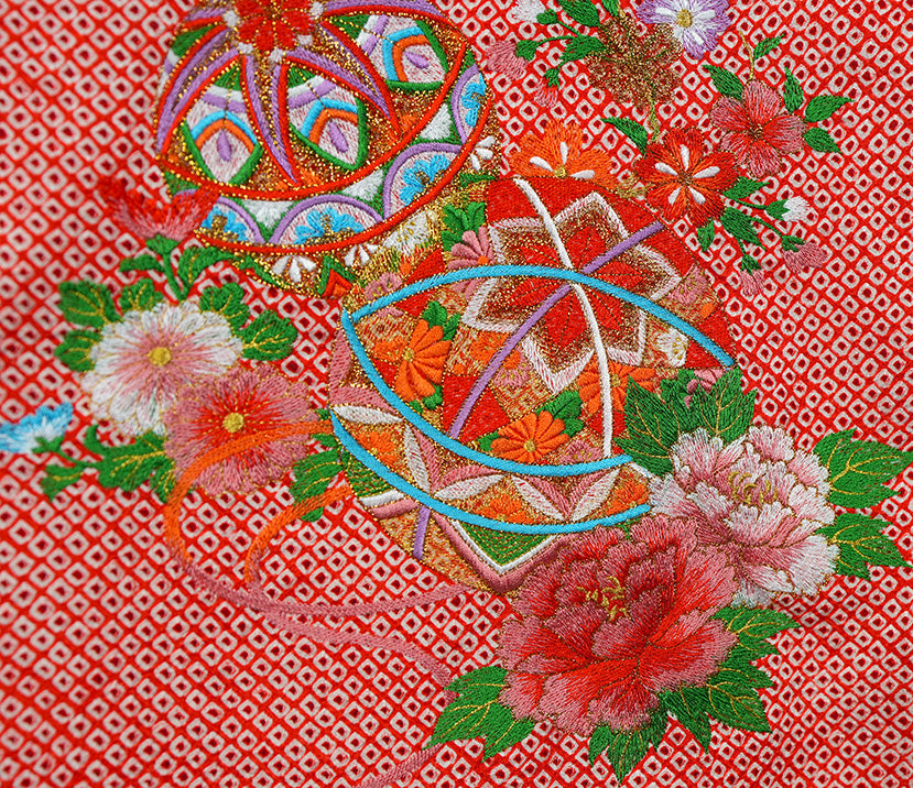 落ち着いた赤の総絞り地に、総刺繍を贅沢に施した一点もの。