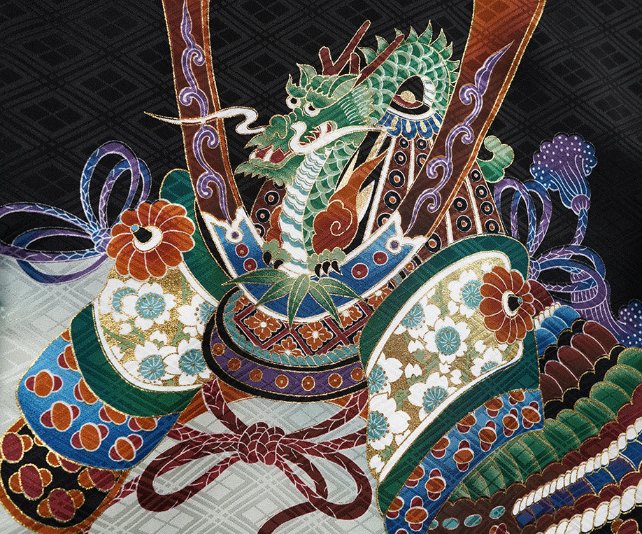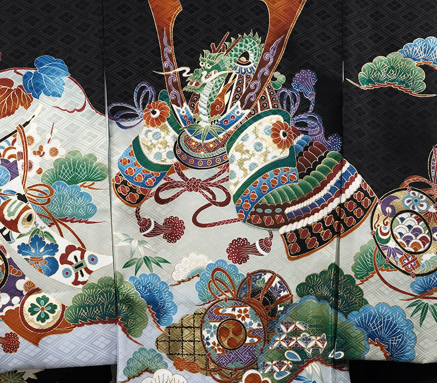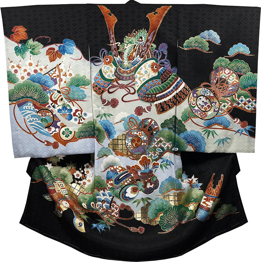黒地に勇ましい兜柄を描いた、男の子用のお宮参り着物です。