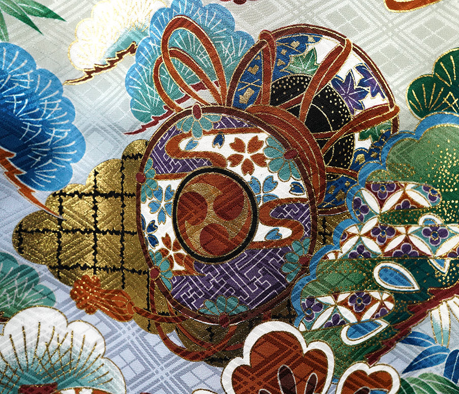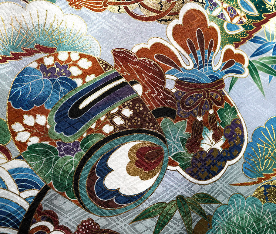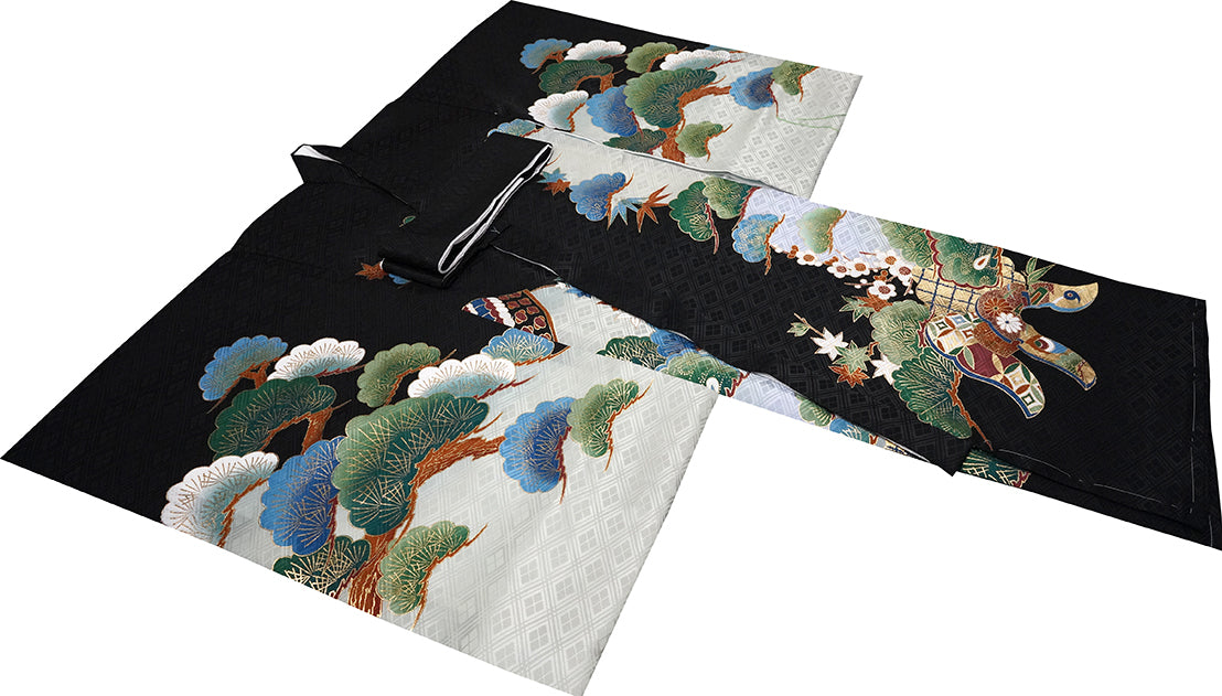 松や吉祥文様が華やかに配され、お祝いの席に相応しい一着です。