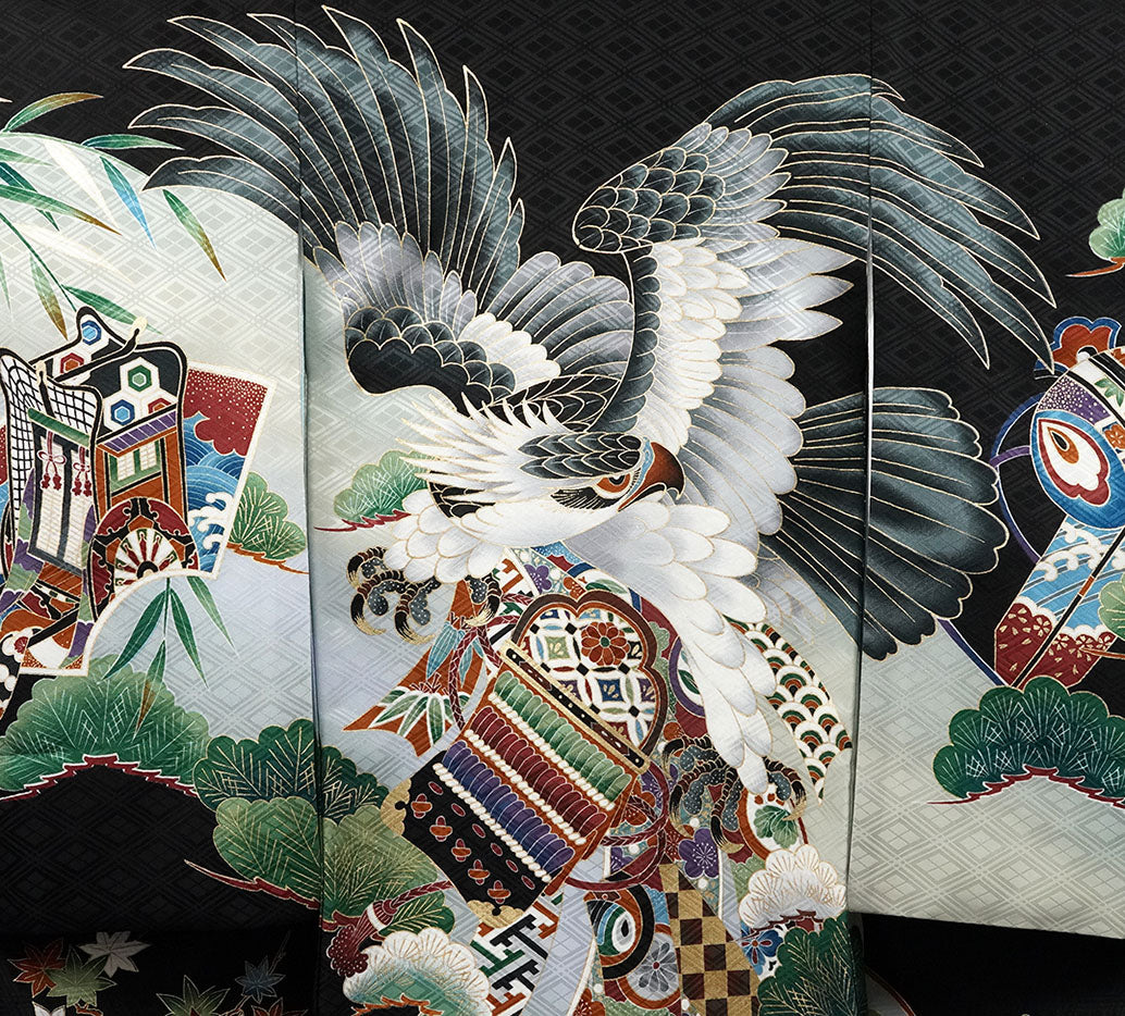 黒地に大きく舞う鷹柄が印象的な、男の子用お宮参り着物です。