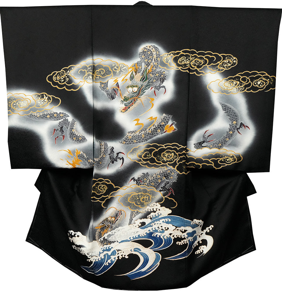 お宮参り着物 男の子 正絹 黒地に雲龍と荒波 〜勇壮なる昇り龍〜d32067