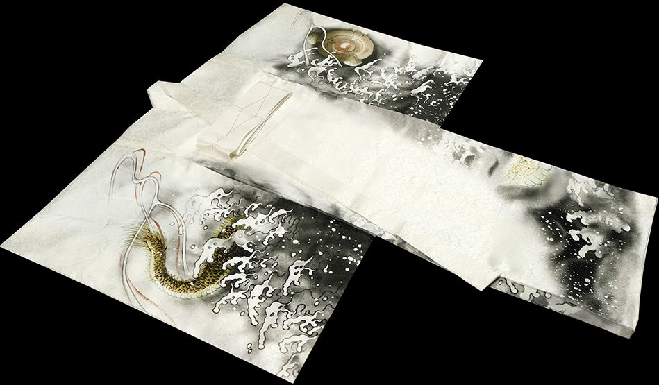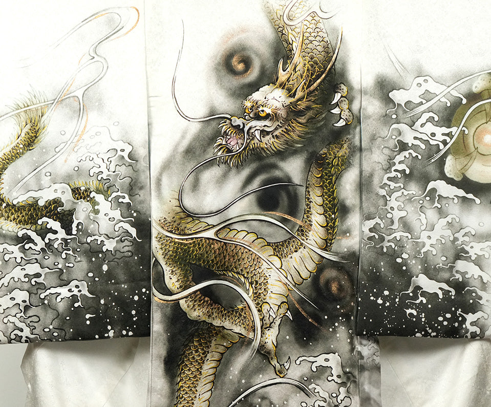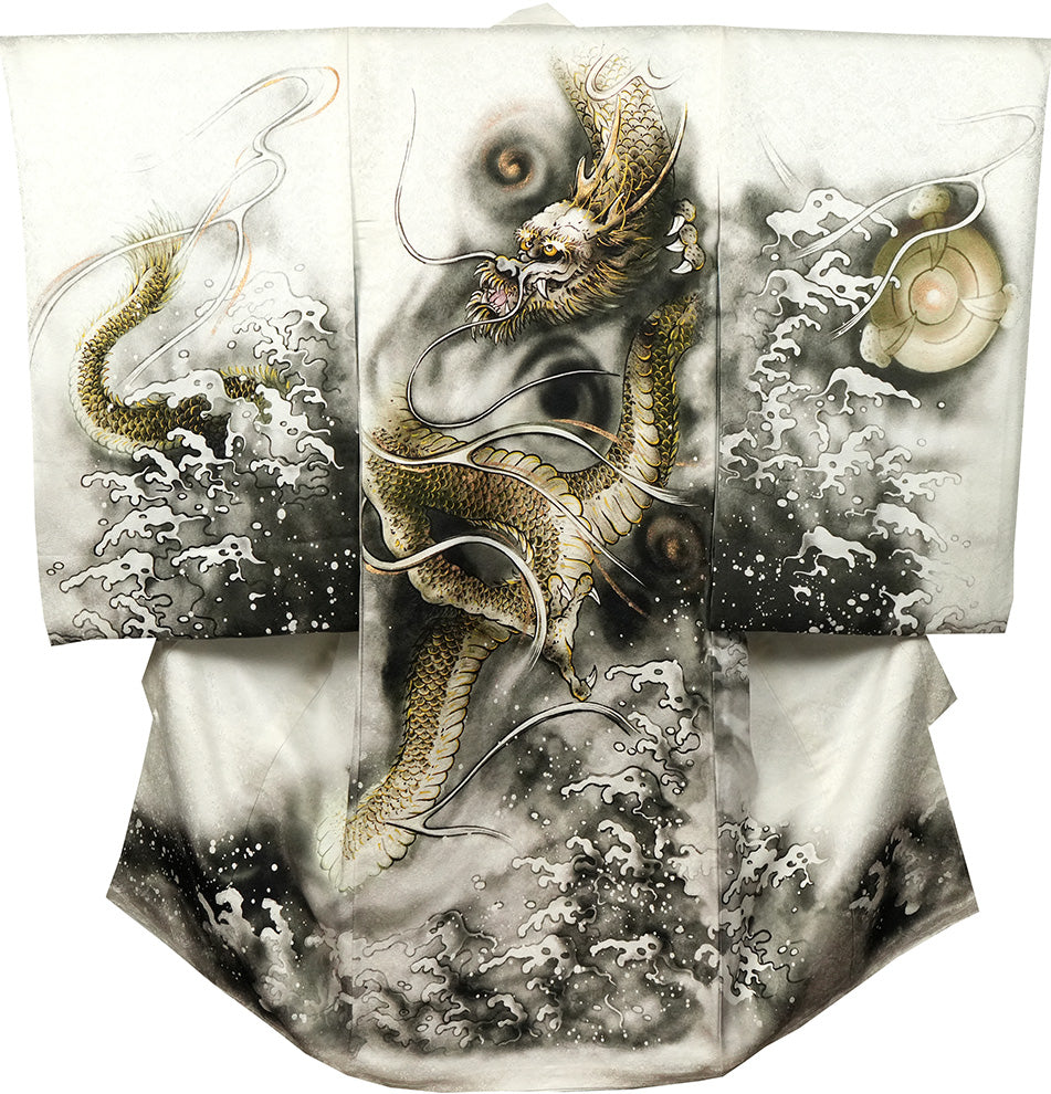 お宮参り着物 男の子 正絹 白地に水墨画風 雲龍と宝珠 〜黄金の龍〜d32068