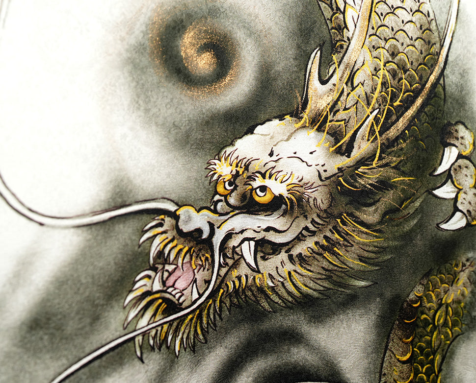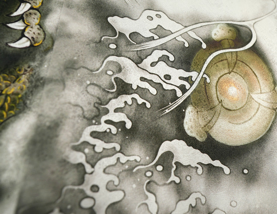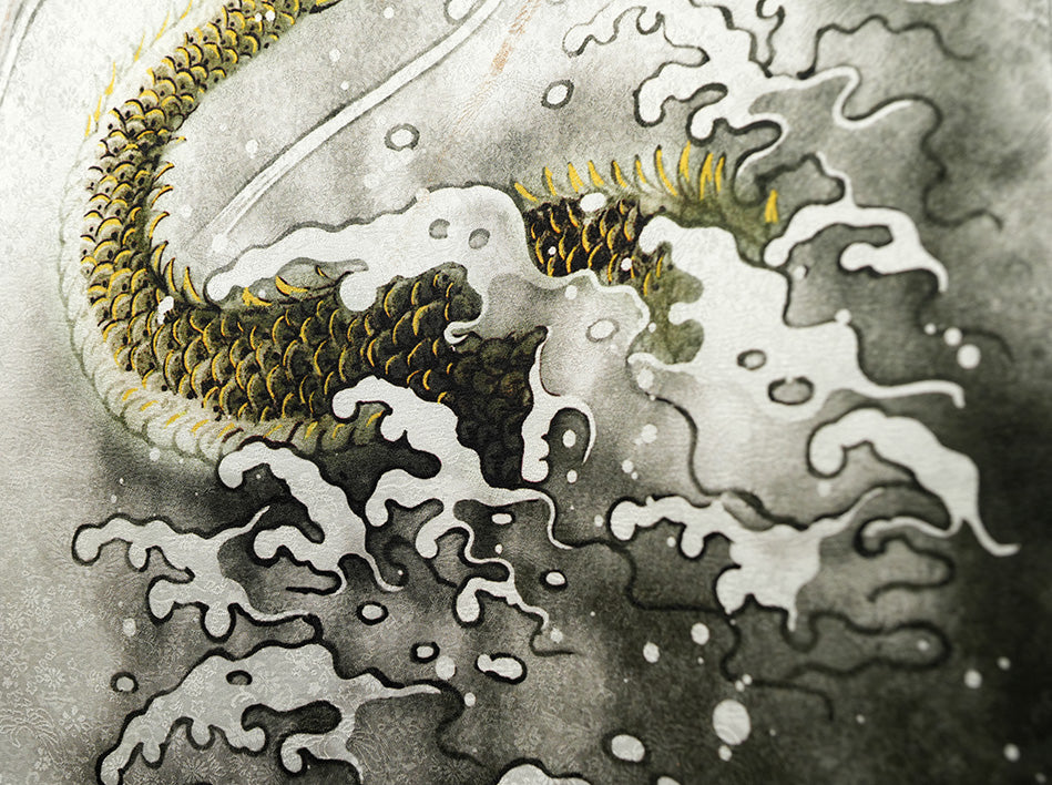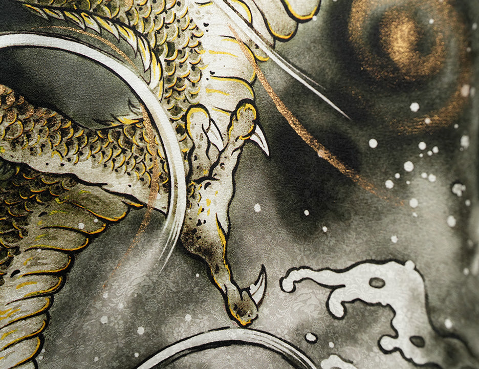 その中心に鎮座する龍は、金彩を施された鱗が光を受け、