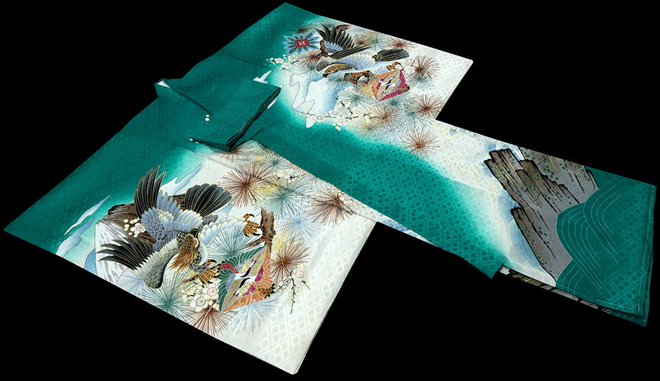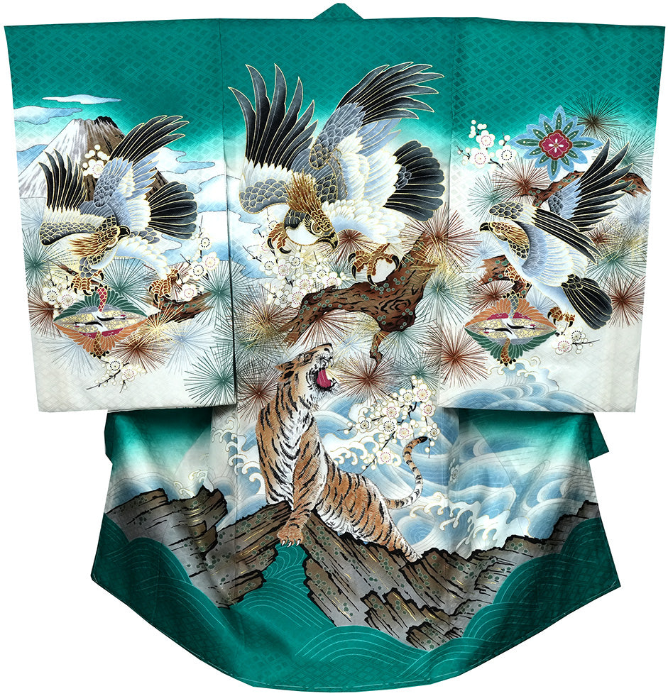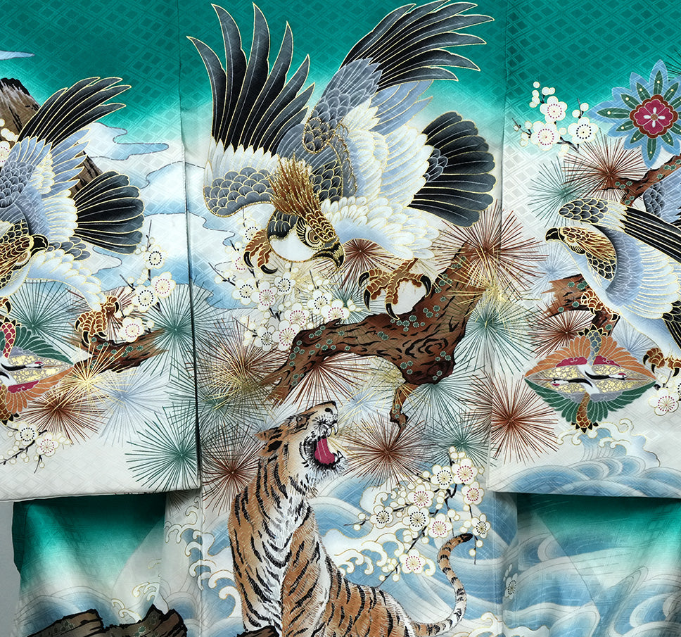 深みのある翡翠色(グリーン系)を基調に、鷹・虎・松・富士・梅が豪華に描かれた、