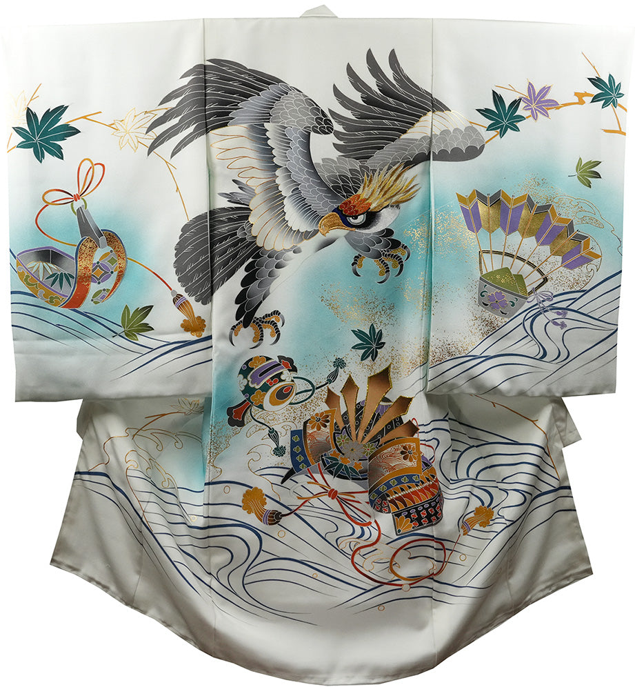 白地に勇ましい鷹柄を描いた、男の子用お宮参り着物です。