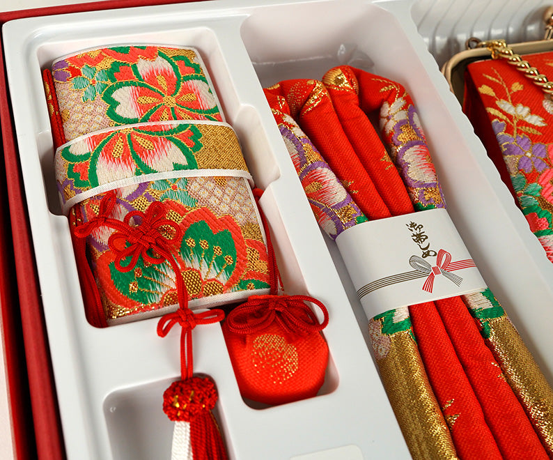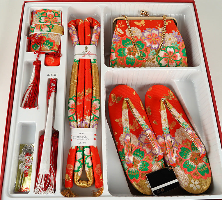 ハコセコ・バッグ・草履などを揃えた、華やかな小物6点セットです。