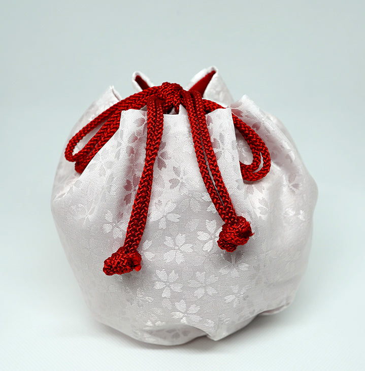 白地に桜柄をあしらった、清楚で可愛らしい巾着。