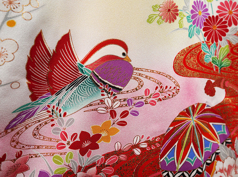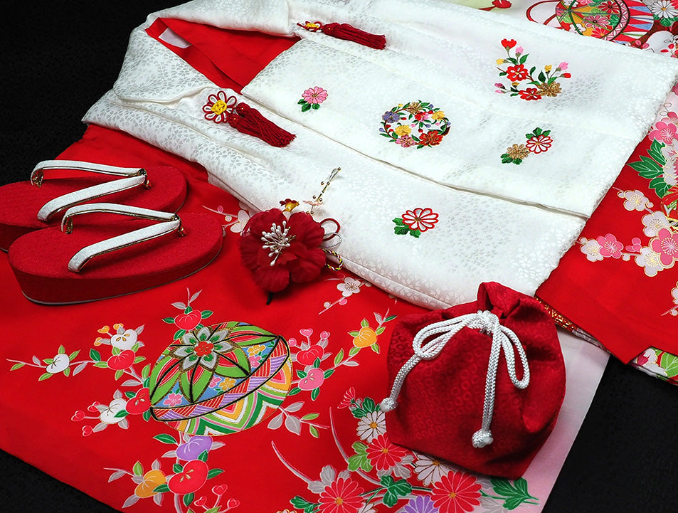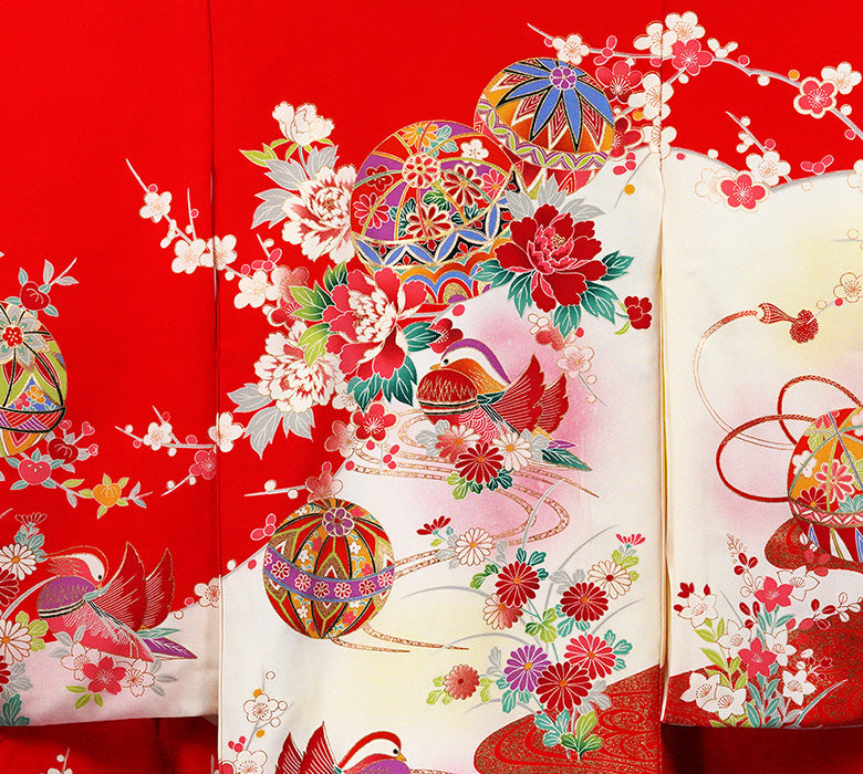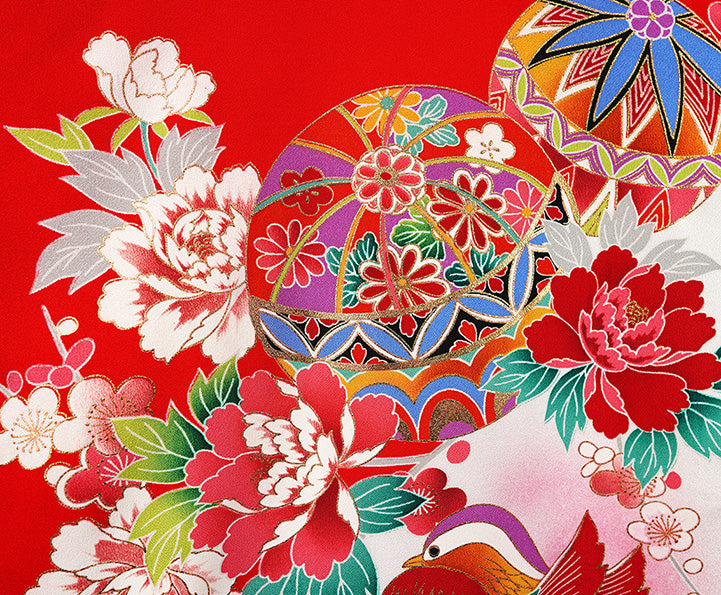 深みのある赤地に、愛らしい鞠柄とおし鳥柄が映え、