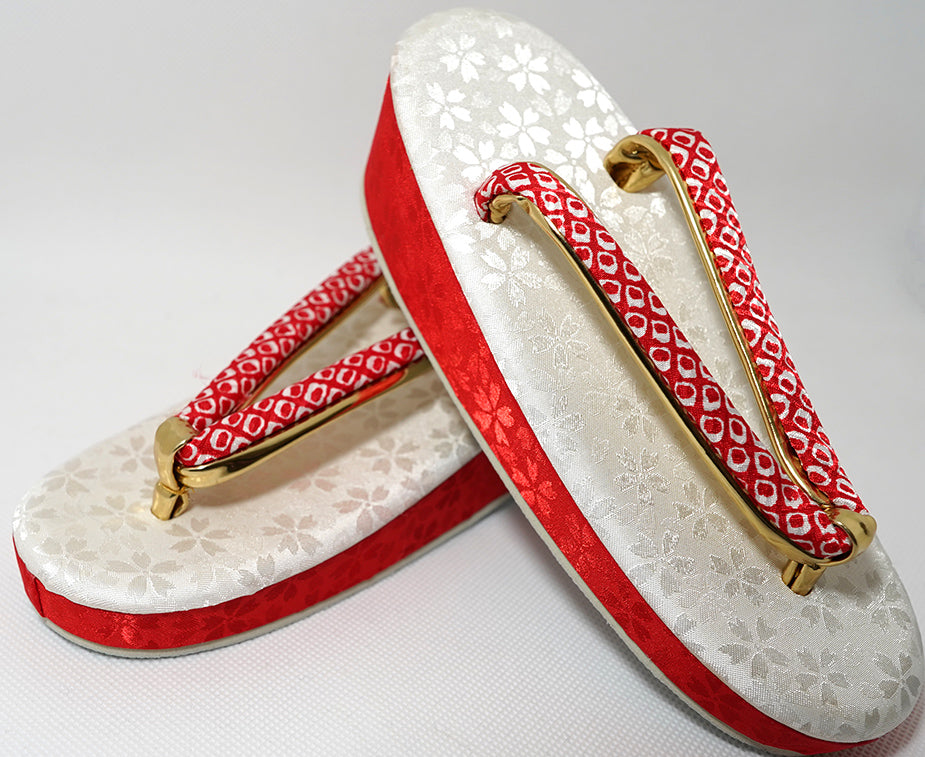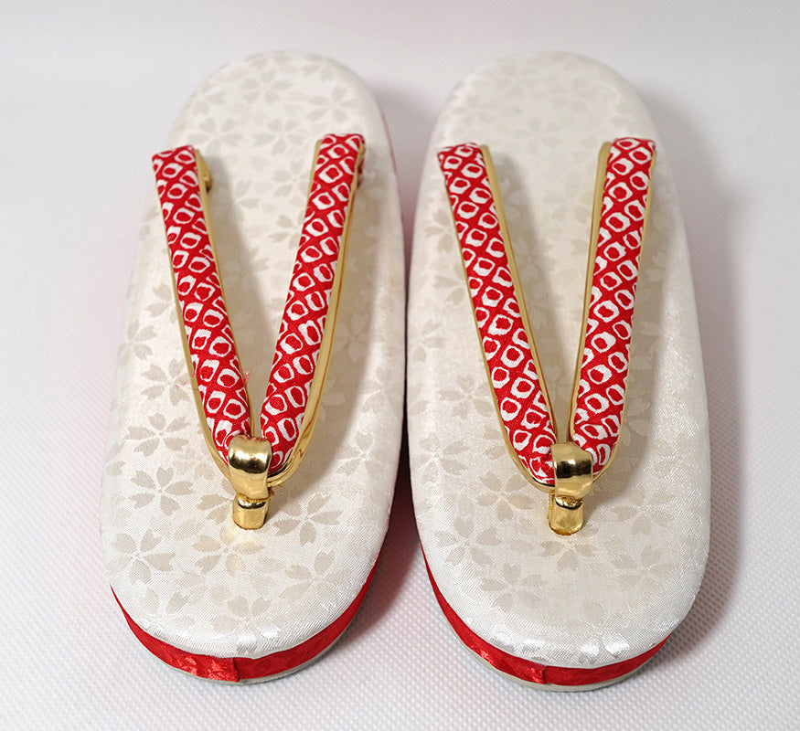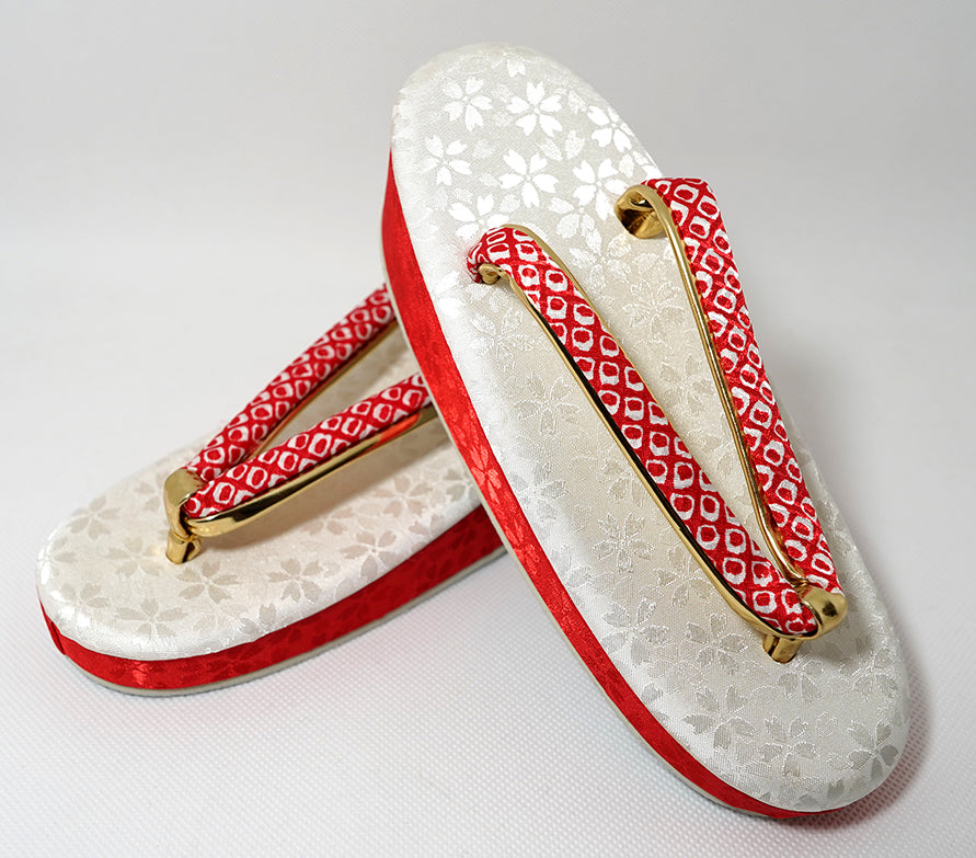 上品な白地に桜柄をあしらった、清楚で華やかな草履です。