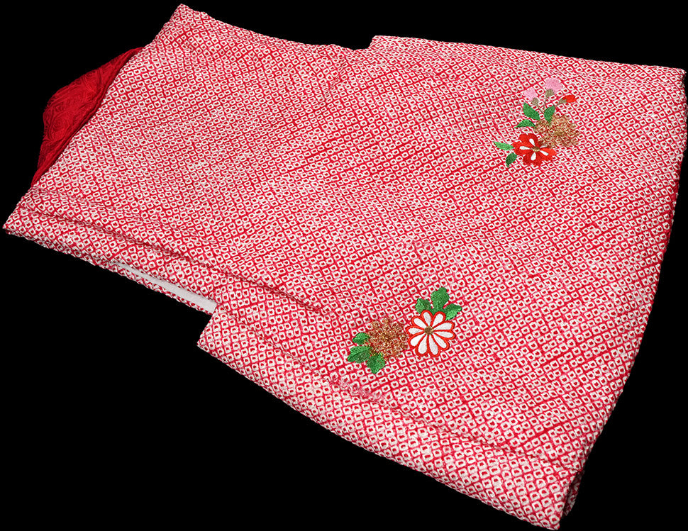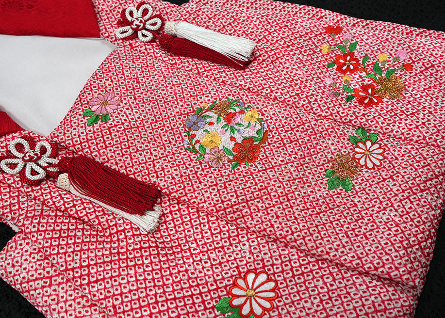 伝統の鹿の子絞りになります。赤の本絞り地に総刺繍。