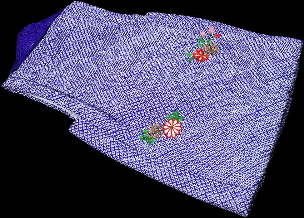 伝統の鹿の子絞りになります。青紫の本絞り地に総刺繍。